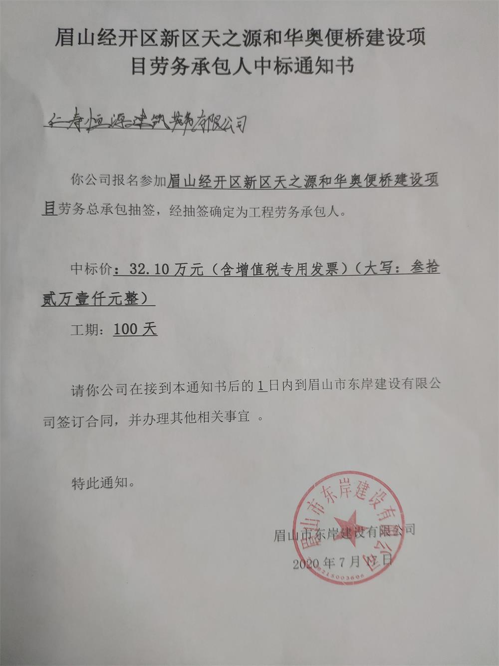 眉山經(jīng)開區(qū)新區(qū)天之源和華奧便橋建設(shè)項目中標(biāo)通知