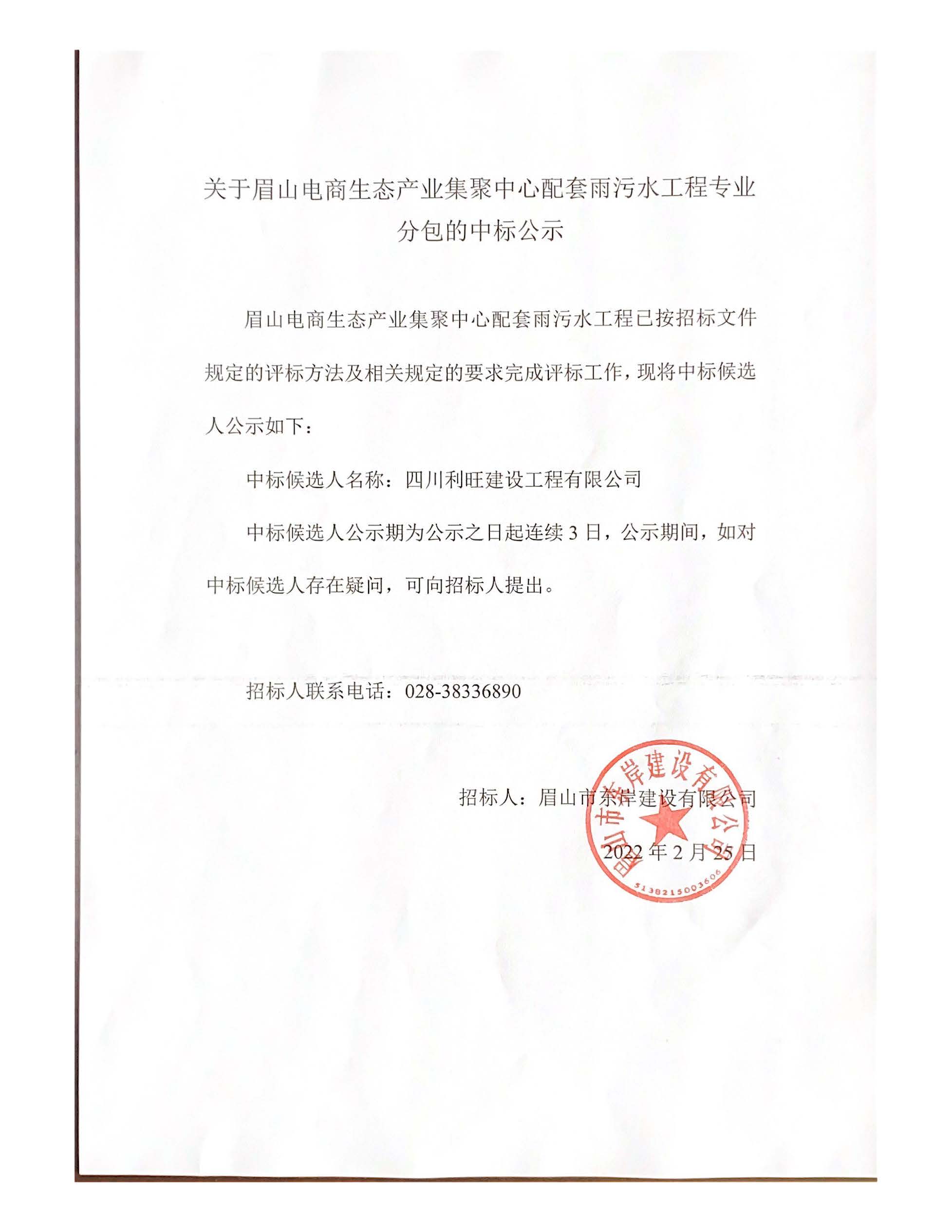 關(guān)于眉山電商生態(tài)產(chǎn)業(yè)集聚中心配套雨污水工程專業(yè)分包的中標(biāo)公示